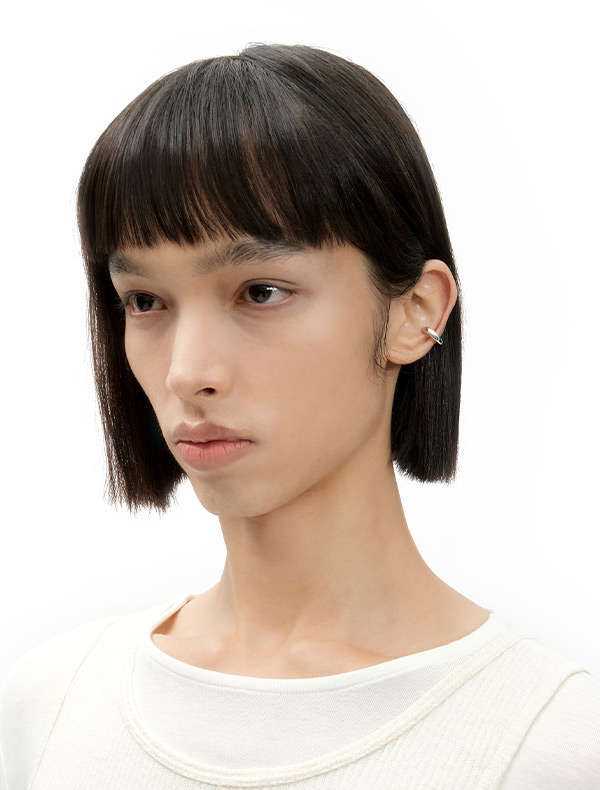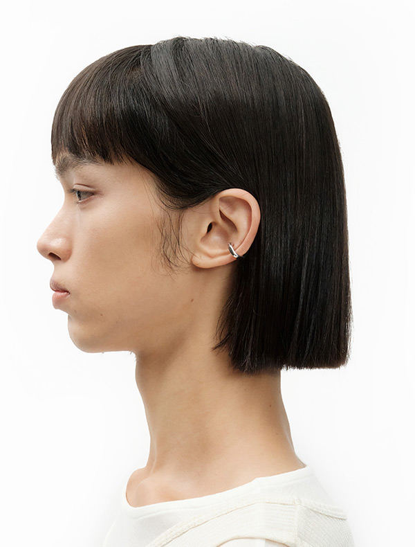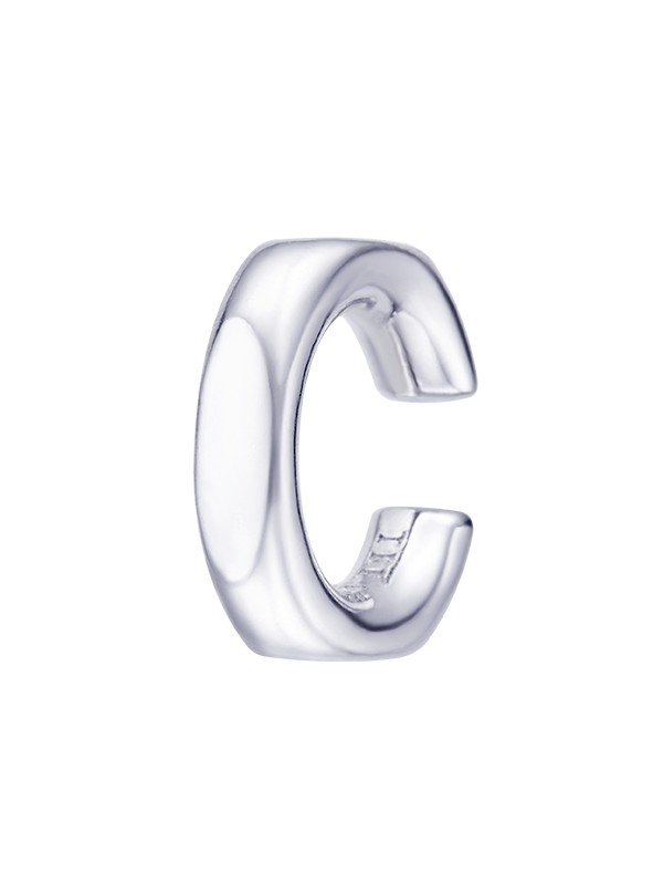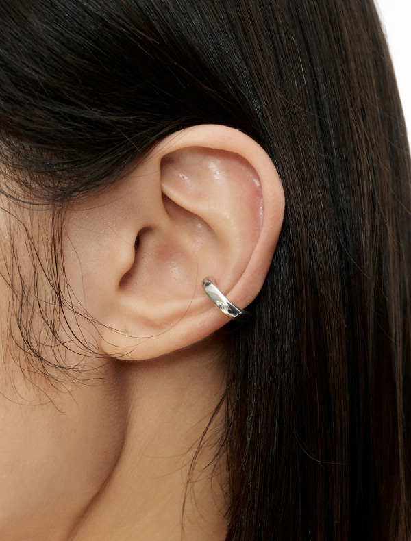 A design that contrasts soft curves with the glossy finish of smooth surfaces. A wearable ear cuff with a simple silhouette.