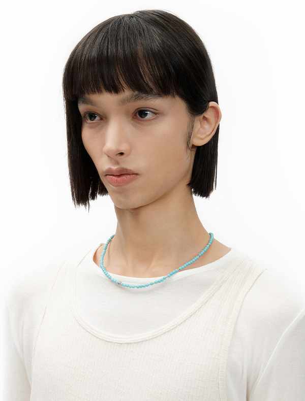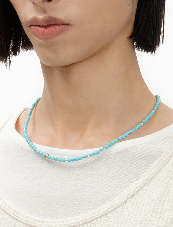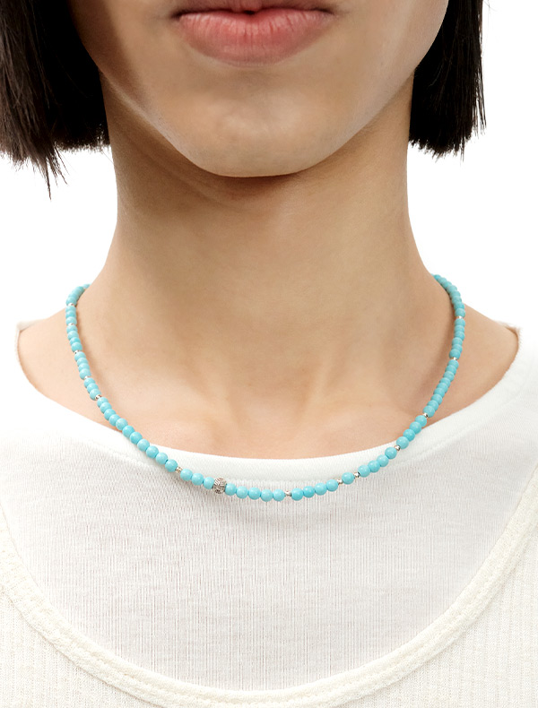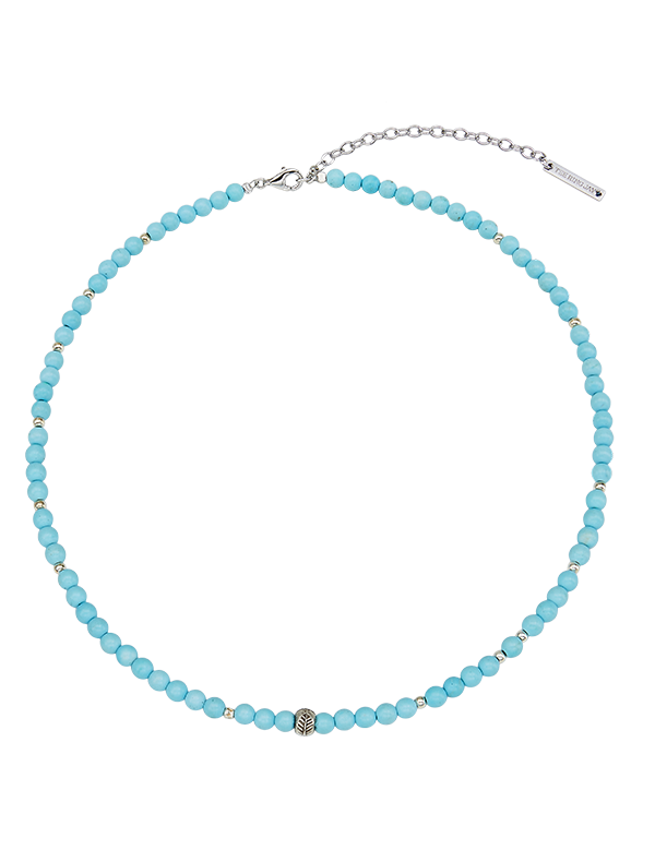 A necklace featuring harmonious turquoise in a tidy hue and silver balls interspersed throughout. A perfect accent piece for a simple look.