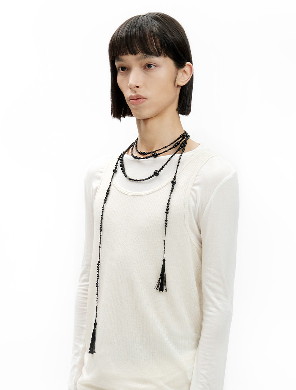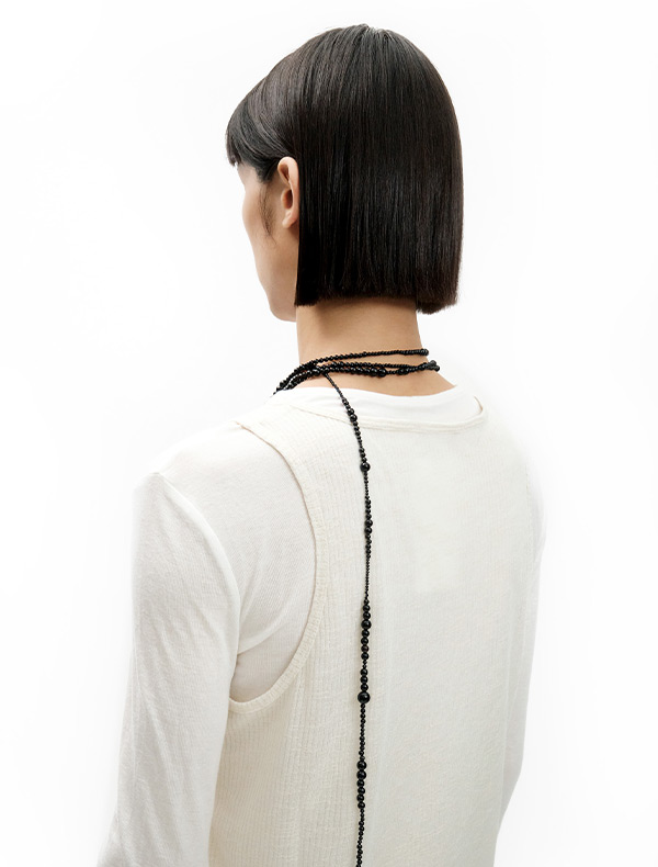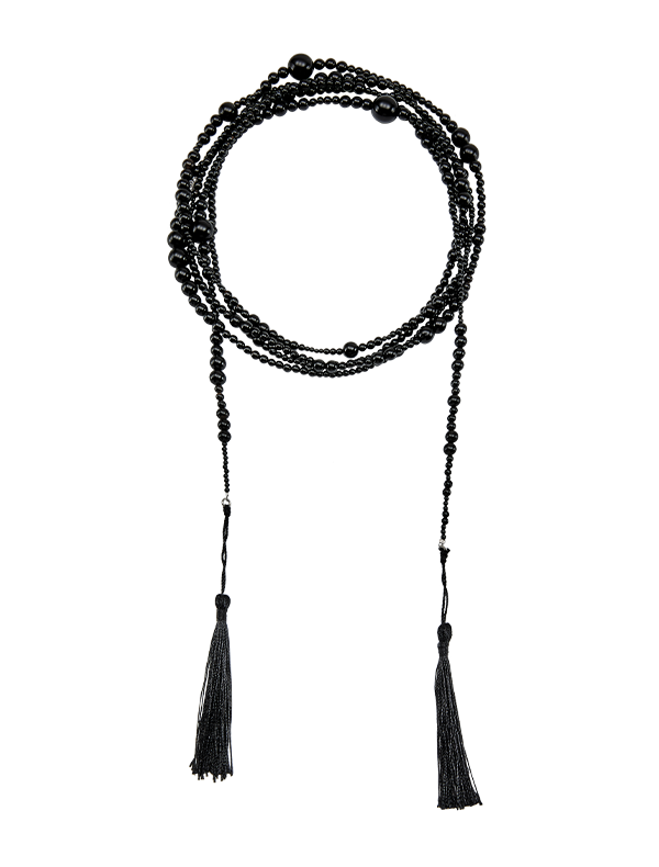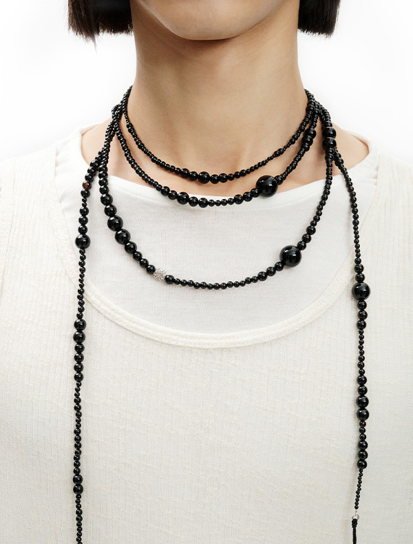 This onyx necklace, with a maxi length of 230cm, captures a free-spirited bohemian mood. It boasts flexible movement and durable durability. It can be styled freely as a necklace or belt.